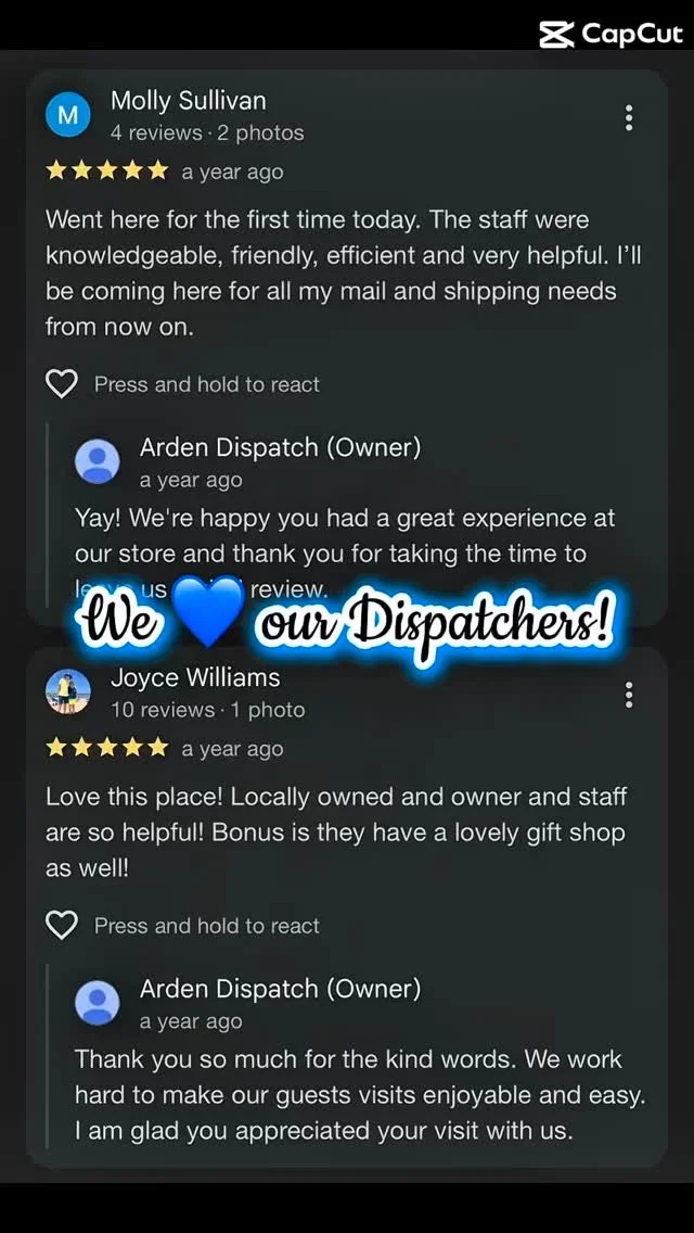 Arden Dispatch is a retail shipping/mailbox/gift store. Come see our cute gifts, cards, and fun employees. Bring the packages your family members left at your house (or any other parcel), and we’ll help you choose from our three carriers (UPS, FedEx, and USPS) to ship with.